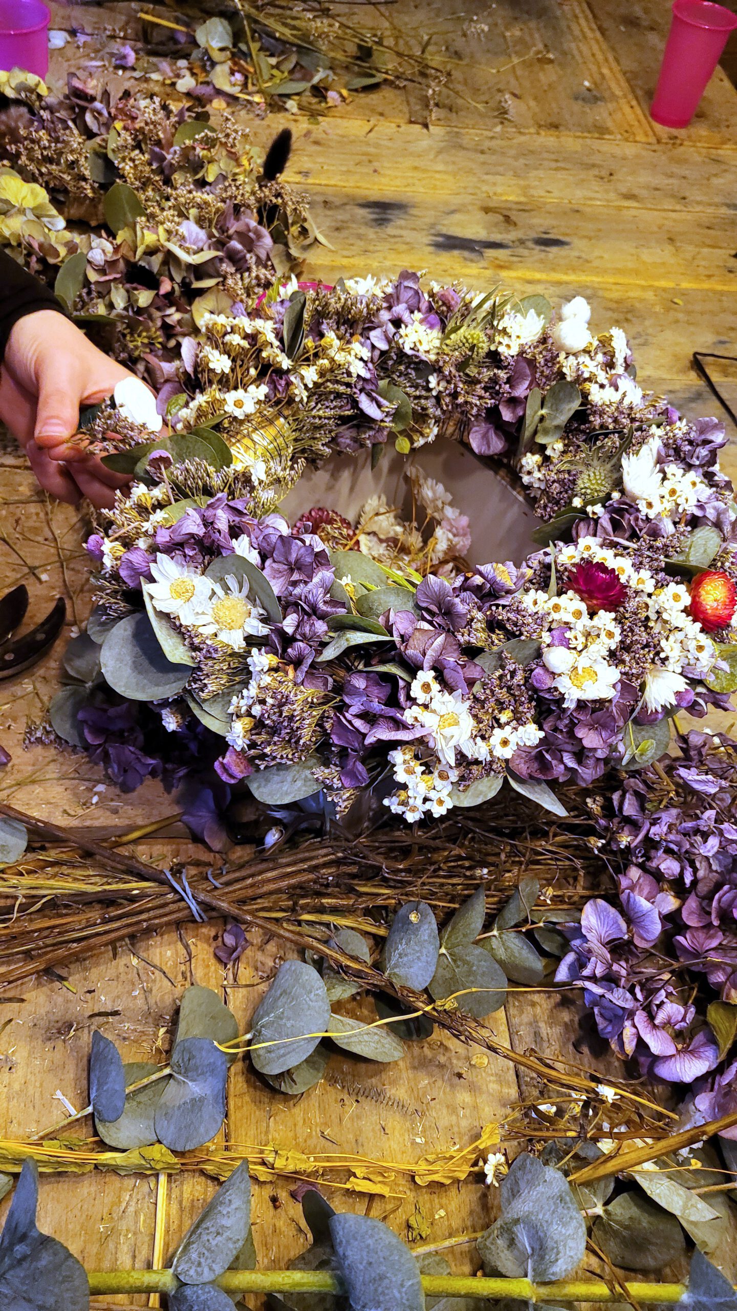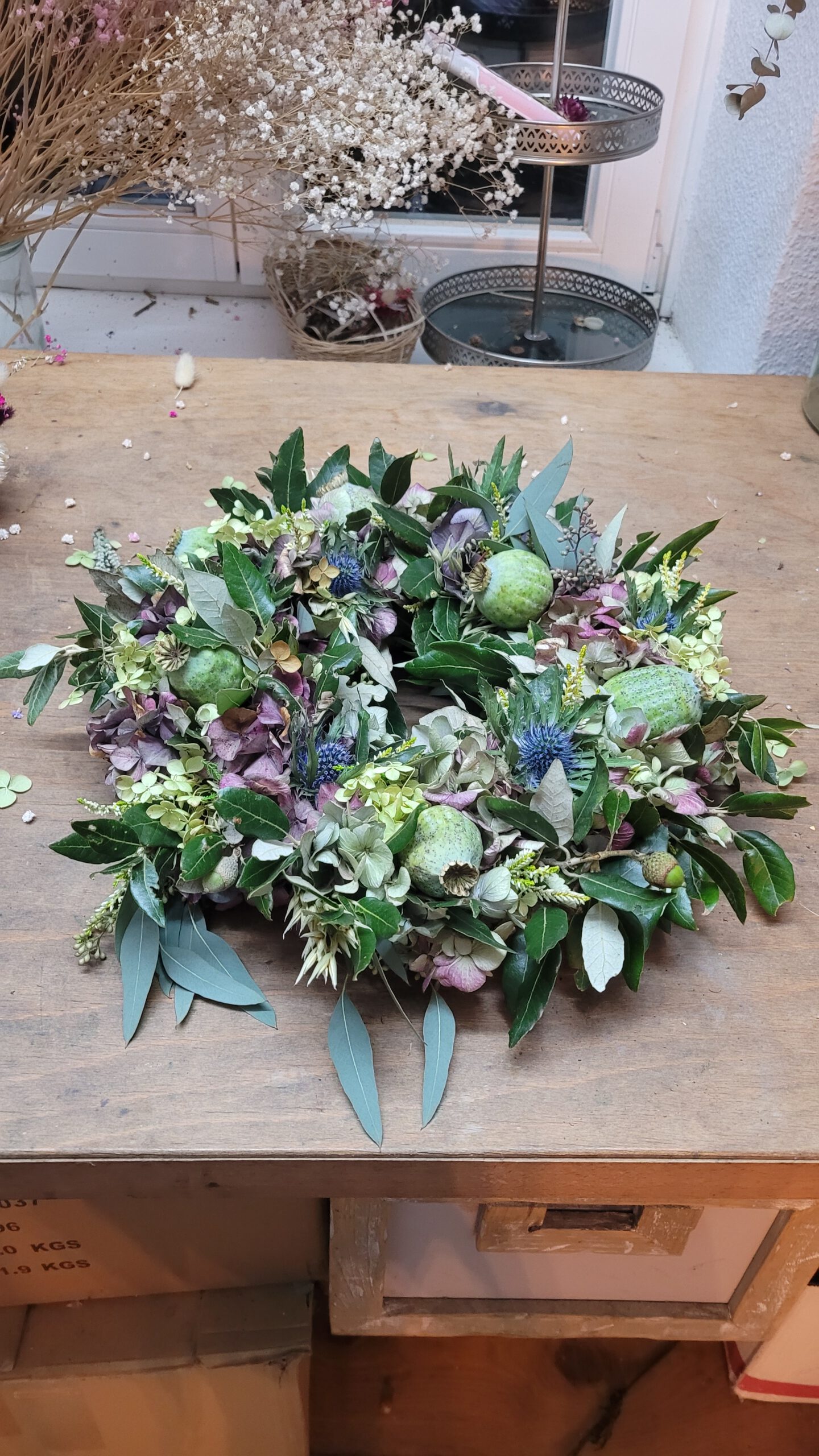 Dieser Workshop richtet sich sowohl an Anfänger als auch an Fortgeschrittene. Aus verschiedenen Naturmaterialien wie unterschiedliches Tannengrün, Eukalyptus, Zapfen, Beeren oder auch Trockenblumen erstellst du unter Anleitung deinen eigenen Adventskranz. Um den Kranz mit Kerzenhaltern, Kerzen, Lichterketten, Kugeln oder anderen Dekoelementen zu schmücken, findest du eine große Auswahl bei mir vor Ort. Du darfst auch gerne deine eigenen Kerzen, Accessoires etc. mitbringen. Dieser Workshop kostet 35€ zzgl. Materialien nach Verbrauch.