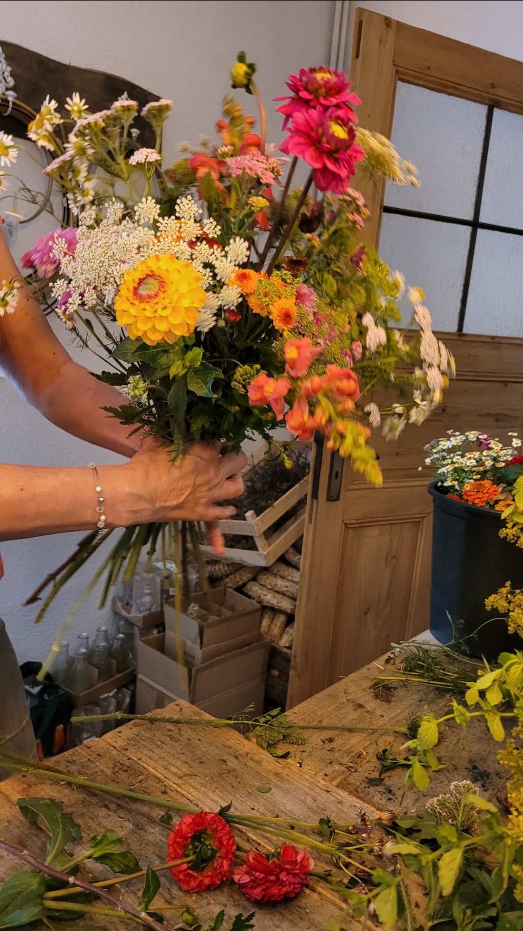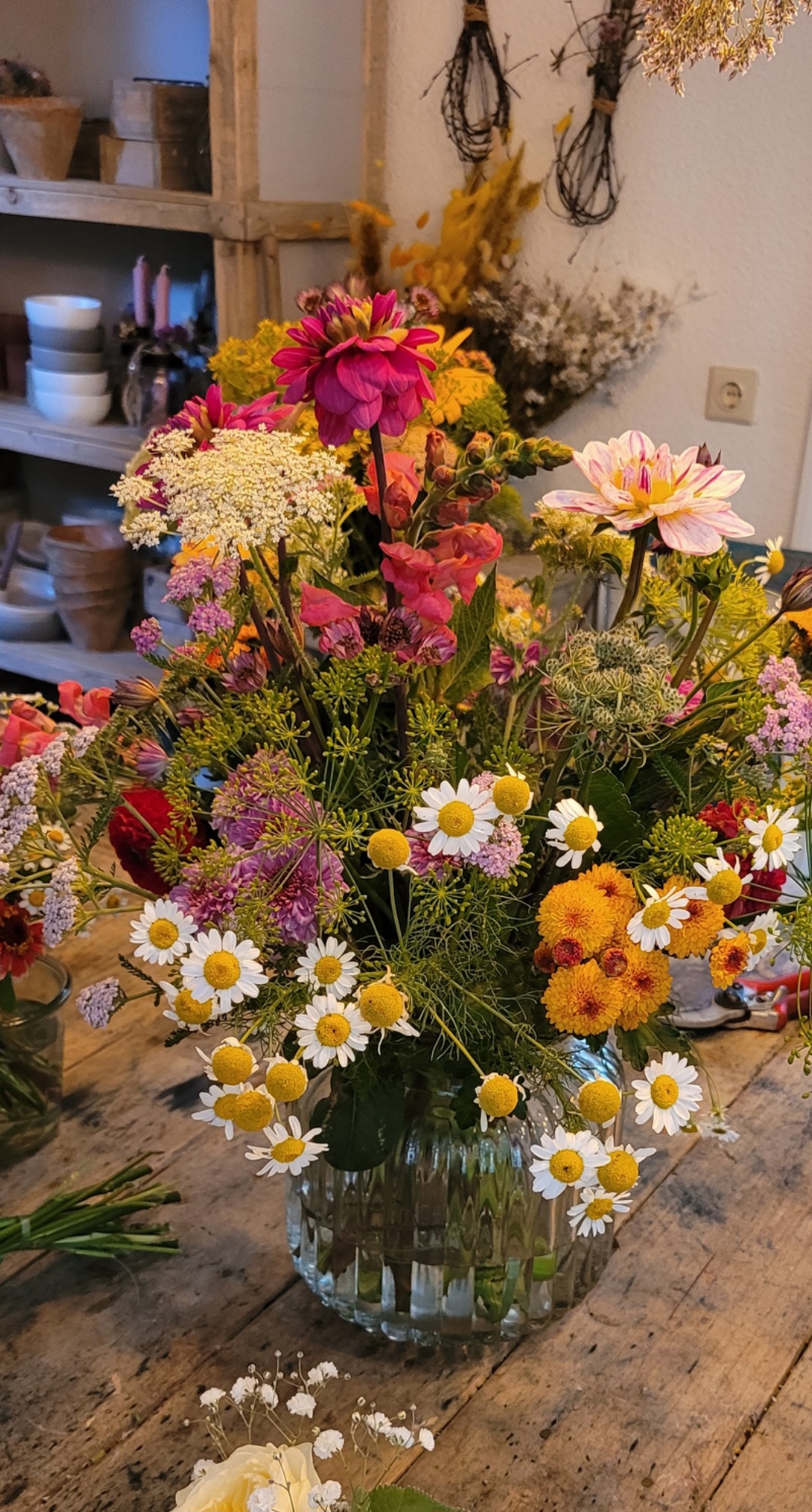 In diesem Workshop könnt ihr euch unter Anleitung sommerleichte Vasenfüllungen, Sommersträuße im Happy-Farben-Mix (mit selbst gepflückten Sommerblumen auf dem Blumenfeld in Schlangen) oder auch eine individuelle Tischdeko aus verschiedenen Sommer- und Wiesenblumen erstellen.