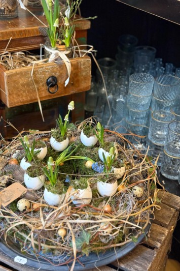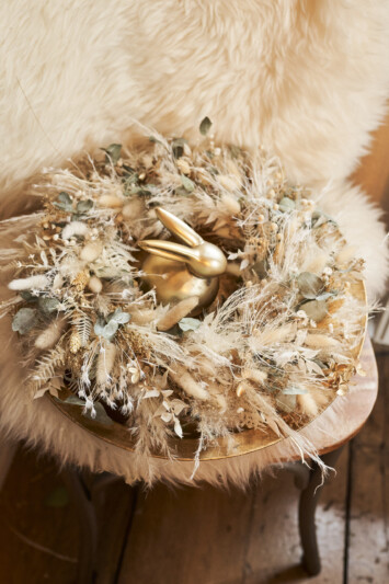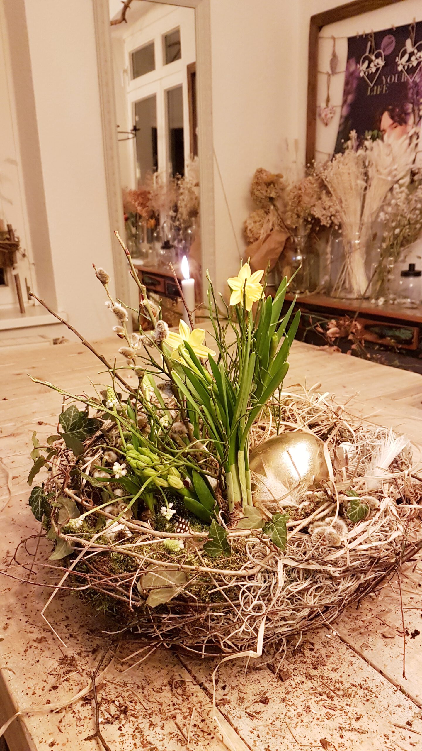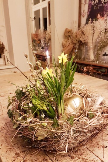 Verschiedene Äste, Zweige, Zwiebeln und Frühlingsblüher verarbeiten wir zu Kränzen, Pflanzgefäßen, Nestern etc. Osteraccessoires wie zarte Federn, Eier oder auch farbenfrohe getrocknete Blüten runden eine vielfältige Materialauswahl perfekt ab.